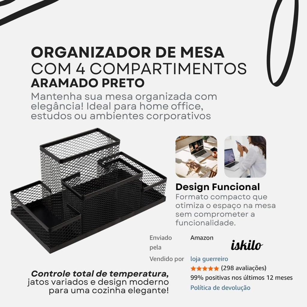 • Design Funcional: Possui quatro compartimentos para armazenar canetas, lápis, clipes e outros materiais de escritório, mantendo sua mesa organizada.